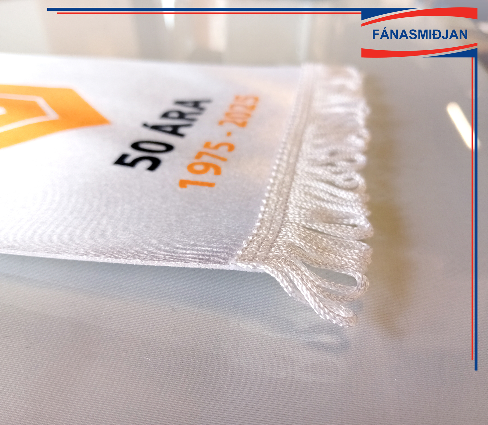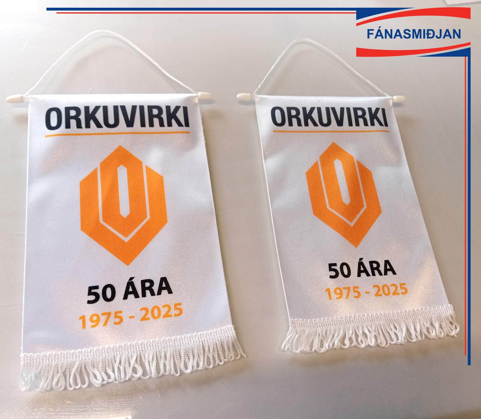 Borðfáninn er prentaður á tvöfalt satín, þverslá og bandi til að hengja hann upp ásamt kögri er innifalið. Við tökum að okkur alla uppsetningu og hönnun ef með þarf og sendum próförk fyrir prentun. Þú sendir okkur lókó eða bara hugmynd og við klárum dæmið.