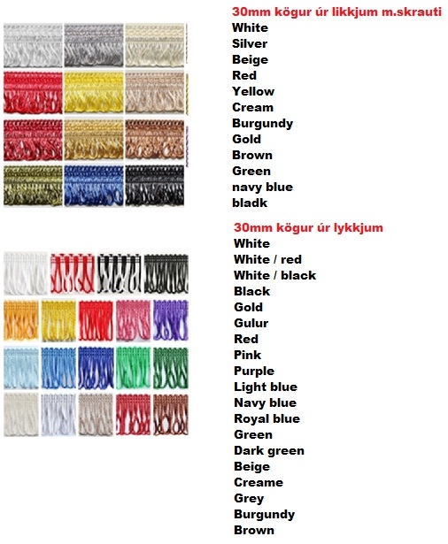 Borðfána Kögur 30mm Kögrið er úr silkiefni og er mikið af þessu úrvali sérpöntunarvara, og gæti tekið tíma að fá, en hafið bara samband og við skoðum hvað er þá til. Efni: 100% Viscose og má þvo í höndum í 40°C. Verð: 1.105 ISK Texti fyrir merkingu Kögur Kögur 30mm