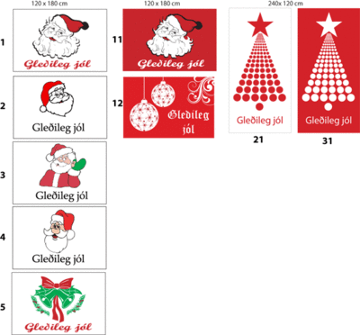 JÓLAFÁNAR Jólafánar 120x180cm fyrir 6metra stöng. (1) (2) (3) (4) (5) (11) (12) Jólafánar 120x250cm fyrir 6merta stöng (21) (31) Verð: 10.417 ISK Eiginleikar Jólafáni 1 120x180Jólafáni 2 120x180Jólafáni 3 120x180Jólafáni 4 120x180Jólafáni 5 120x180Jólafáni 11 120x180Jólafáni 12 120x180Jólafáni 21 250x120Jólafáni 31 250x120 Valmöguleikar: Jólafáni 1 120x180 - 10417 ISKJólafáni 2 120x180 - 10417 ISKJólafáni 3 120x180 - 10417 ISKJólafáni 4 120x180 - 10417 ISKJólafáni 5 120x180 - 10417 ISKJólafáni 11 120x180 - 13554 ISKJólafáni 12 120x180 - 13554 ISKJólafáni 21 250x120 - 16064 ISKJólafáni 31 250x120 - 16064 ISK Texti fyrir merkingu Jólafáni jólafánar