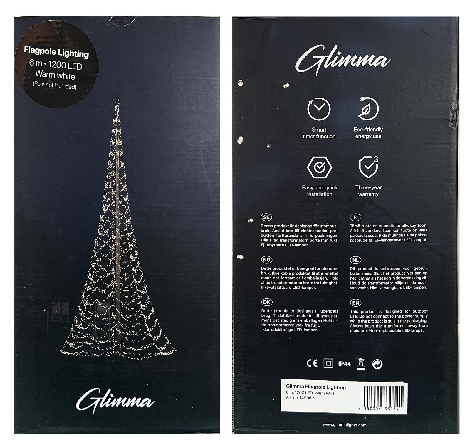 Jólaljós Jólaljósa serian er hifð upp í stöngina og fest í hring út frá stönginni að neðan með hælum. Jólaljósa umbúðir Jólaljósa seria með 1200 led ljósum Verð: 78.000 ISK Valmöguleikar: Jólaljós fyrir 6m stöng - 78000 ISK Texti fyrir merkingu jólaljós jólaljós á fánastöng fánastöng