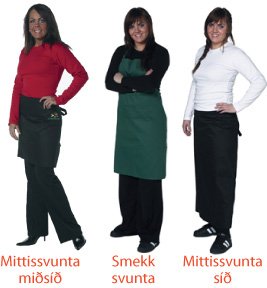 SVUNTUR Svuntur af mörgum gerðum og litum Mjög sterkar svuntur sem eru úr 65% polyester og 35% bómull. Efnisþyngd efnis 200g/m2. Böndin eru úr sama efni. Hægt er að setja merkingar á þær eftir óskum viðskiptavinar.