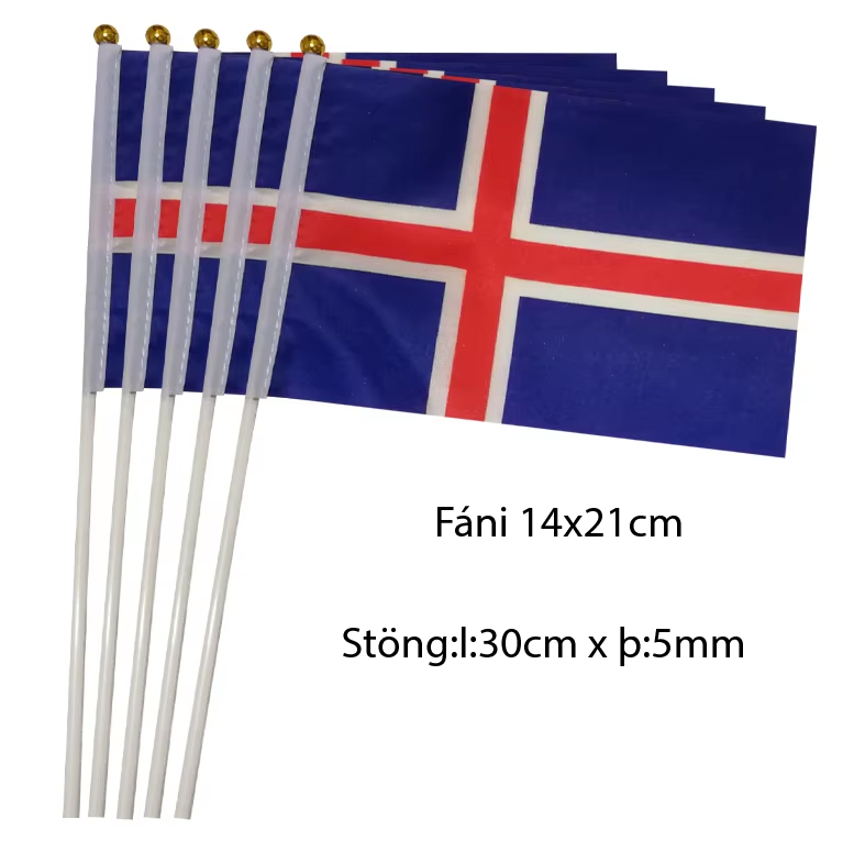 Íslenski fáninn - á priki Íslenski fáninn á plaststöng með gylltum hnúð Fáni á stöng Íslenski fáninn á 5mm plaststöng með gylltum toppi. Verð: 2.500 ISK Eiginleikar íslenski fáninn 14x21cm á 5mm priki 5 stk í patningu Valmöguleikar: Íslenski fáninn 14x21 á 30cm priki 5 stk - 2500 ISK Texti fyrir merkingu íslenski Fáni á priki íslenski fáninn á priki