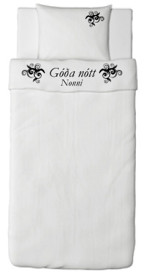 RÚMFÖT Rúmföt, fullorðins stærð Rúmföt til merkinga. Rúmföt úr 100% gæða bómull. Sængurver l:200 x b:150cm Koddaver l:50 x b:60 cm Hægt að gera margskonar merkingar Biðjið um verð og tillögur að merkingum. Svona rúmföt kosta t.d. 11.500kr með merkingu. Þú velur nafn, lit og leturgerð Verð: 11.500 ISK Eiginleikar Hvít rúmfötRauð rúmfötHvít rúmföt með merkingu+nafnRauð rúmföt með merkingu+nafn Valmöguleikar: Hvít m.merkingu 200x150cm - 11500 ISKRauð m.merkingu 200x150cm - 11500 ISK Litur á merkingu: HvíturKóngabláttSvarturRauttGylltSilfurNeon bleikNeon gul Letur á merkingu: Arial RegularArial BoldTimes New RomanSkrautskrift - Old English Texti fyrir merkingu Tegundir Rúmföt, fullorðins stærð 11.500 ISK 0 ISK rúmföt sængurföt